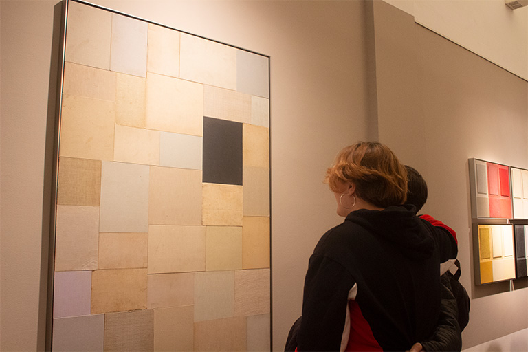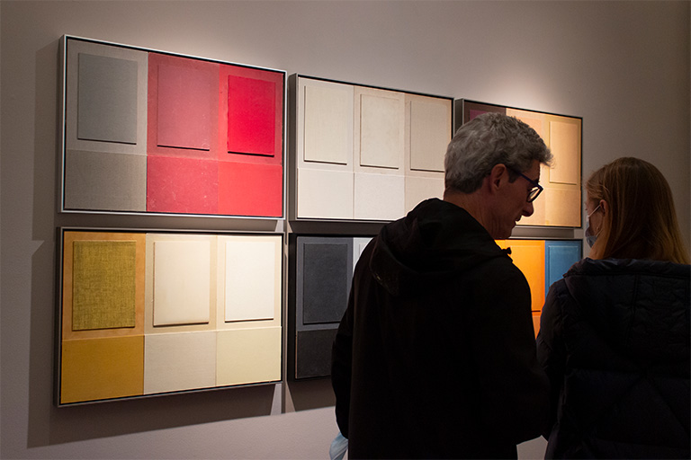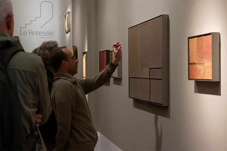 En esta nueva exposición para La Antesala del Ateneo, descubrimos al Pedro Zamora más cercano. Como siempre, cartones y libros desechados son su principal materia prima, por lo que reconocemos su habitual “paleta” sin pintura de ocres claros y negros apagados, que contrasta con piezas de naranjas y burdeos intensos. Las propias texturas e hilos de los materiales usados dan el contrapunto a los tonos planos que se combinan creando una exquisita y equilibrada composición.