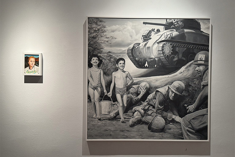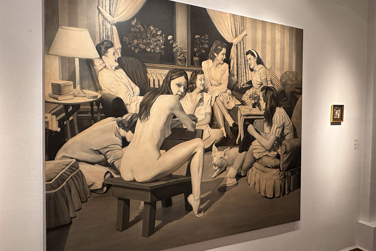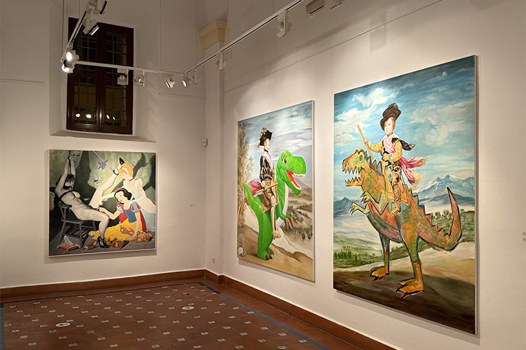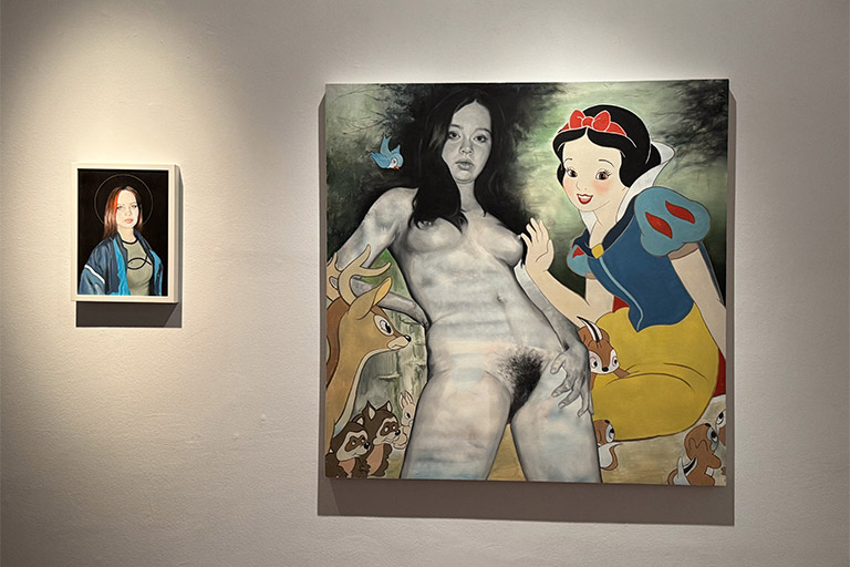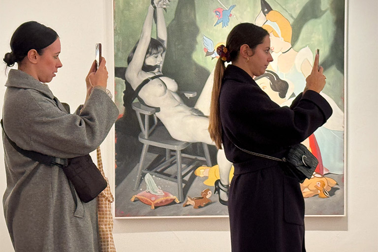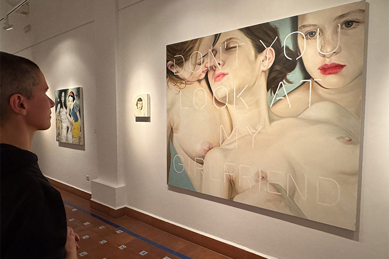 Dentro del recorrido expositivo hallamos emociones que nos pueden marcar sonrisas en los labios, pellizcar el estómago y hacer sonrojar las mejillas. Alejandro nos lleva de viaje a través de su proceso creativo con comparadas donde nos dan la bienvenida grandes formatos con composiciones realmente juguetonas y divertidas llenas de matices y colores vibrantes. Nos encontramos frente a piezas en blanco y negro donde los elementos cotidianos se convierten en elementos disruptivos dentro de contextos como una escena bélica o de salón. Destacan el cuerpo, la sexualización y lo erótico cómo grandes protagonistas. Encontramos el desnudo en algunas ocasiones como llamada de atención dentro de contextos sociales normalizados, y al mismo tiempo el cuerpo y el juego erótico están presentes cómo expresión en sí misma, rompiendo tabúes todavía hoy perpetuados por una sociedad de doble moral que por un lado los incentiva y por otro los niega y oculta. Destacan piezas que muestran una mirada cruda y crítica hacia la hipersexualización con el uso de iconos populares que pertenecen a la memoria visual infantil combinados con situaciones eróticas explícitas. Y también relevantes las paradas en los pequeños formatos donde el retrato, tipología destacada dentro de la trayectoria del artista, arroja su particular visión de la juventud y la actualidad.