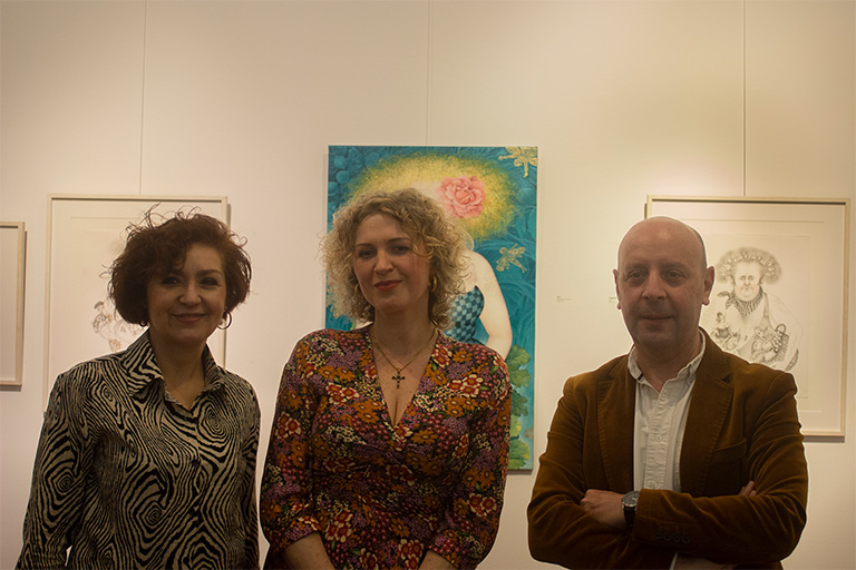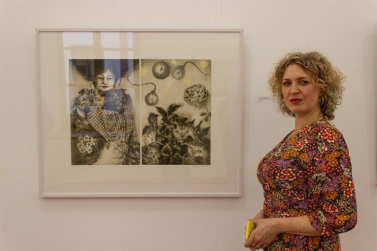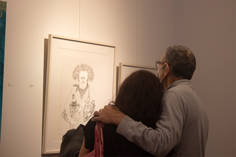 La disciplina artística más destacada de la exposición es el grabado, la técnica más antigua de impresión sobre papel a través de planchas de metal. Svetlana traslada al papel su universo propio mediante la técnica de mezzotinta o manera negra, que le permite crear profundos fondos negros, luminosos blancos y atmósferas singulares que sirven de escenario a sus característicos personajes.