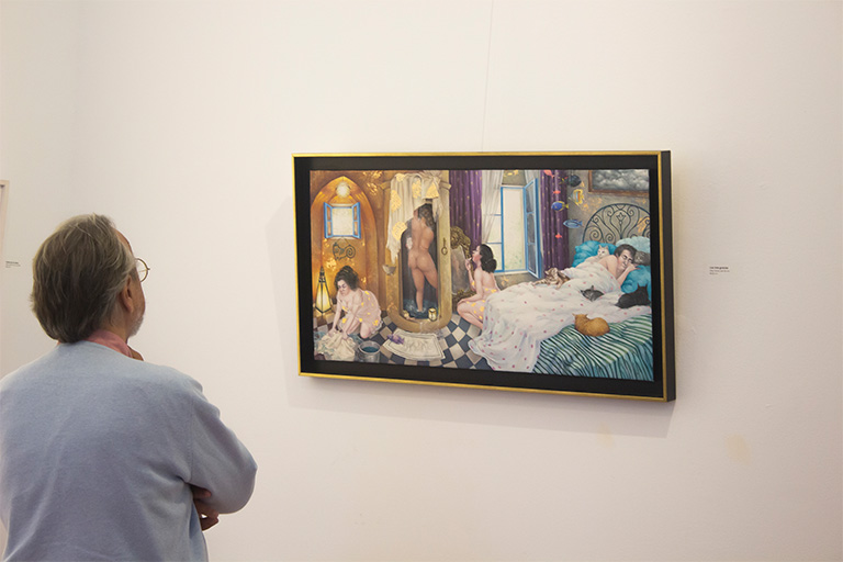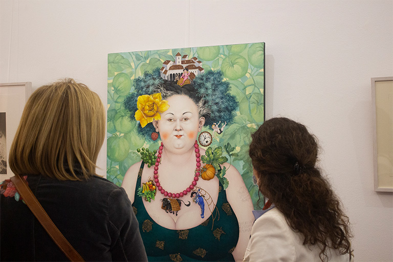Su inconfundible obra expresa un gran dominio del oficio de pintar, su arte expuesto de forma única describe con gran maestría situaciones de complicidad e ironía entre los personajes; atrapa y lleva al espectador al mundo de la fantasía mezclada con la realidad. En este Mundo de fantasía mezclado con la realidad, el que caracteriza la obra de Svetlana Kalachnik, hay cabida para distintas situaciones serias o irónicas, paisajes oníricos, personajes en constante movimiento, días de paz o tormenta, mundo de color… En un mismo espacio aparentemente tranquilo pueden coexistir diferentes relatos. Todos ellos pueden o no estar relacionados. Cada personaje esconde su pequeño drama sean las mujeres que realizan sus tareas de casa o sean los hombres que juegan. El espacio de la cocina emana luz por los lugares más insospechados. Todos los rincones nos ofrecen una vida paralela.