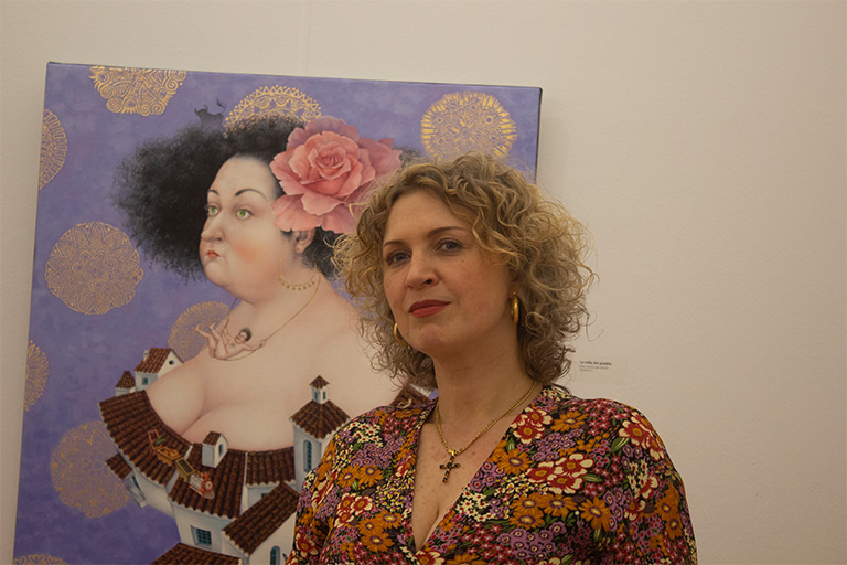Cada escenografía onírica, de aparente tranquilidad, esta bañada de luminosidad y color, cada ser de sus cuadros tiene historias que contar. Su estilo propio la artista denomina «figurativo mágico».