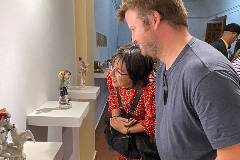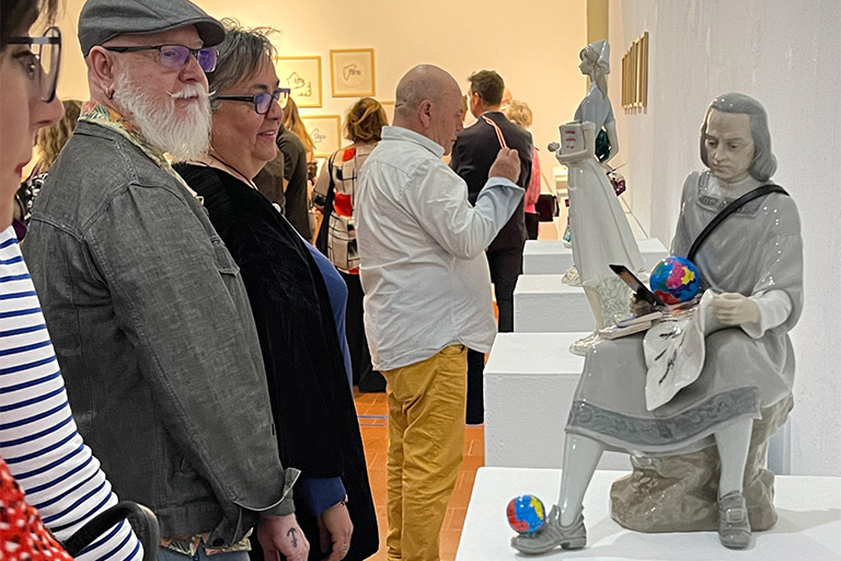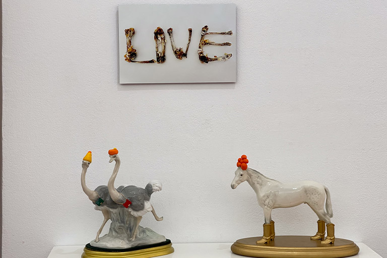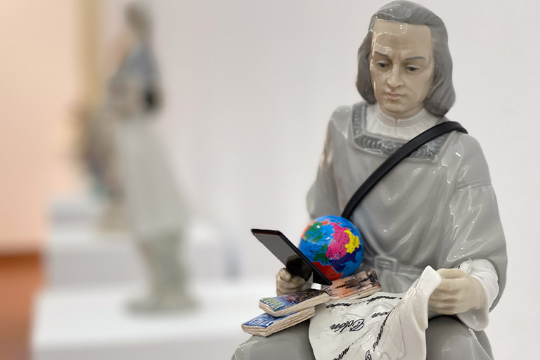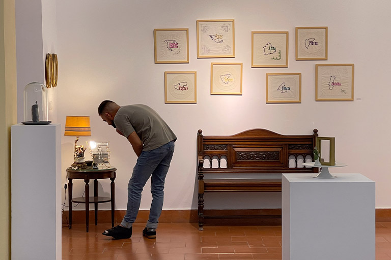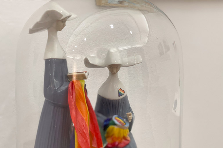 Entre las piezas que podrán verse en esta nueva exposición, despunta una en la que Fuentes retoma con ironía el trabajo artesanal. A modo de pañuelos de bolsillo con adornos primorosamente bordados, se culminan los contornos geográficos de países y ciudades y, sobre cada uno de ellos en colores vivos, los nombres que en cada cultura se da a los homosexuales: Cancos, Sarasas, Apios, Pájaros … Como si se tratara de poblaciones aborígenes, o de exóticas especies florales provenientes de países inexplorados. Podríamos decir que estos pañuelos-mapa recogen el toque de “distinción” masculina que representan, para destacar la diferencia sexual socialmente despreciada, que se pone aquí a disposición del espectador por medio de un irónico giro semántico de “desviación” o “inversión”. Así ocurre también con la pieza de porcelana intervenida “Caballe”, un caballo con botas y penacho, un homenaje festivo a la Drag Queen. También destacan en “Mira si estamos contentos”, dos retratos fotográficos del artista realizados uno por Eugenie Hrotchuk y el otro por Martín de Arriba; dos versiones inéditas del Juanjo más Rose Sèlavy.