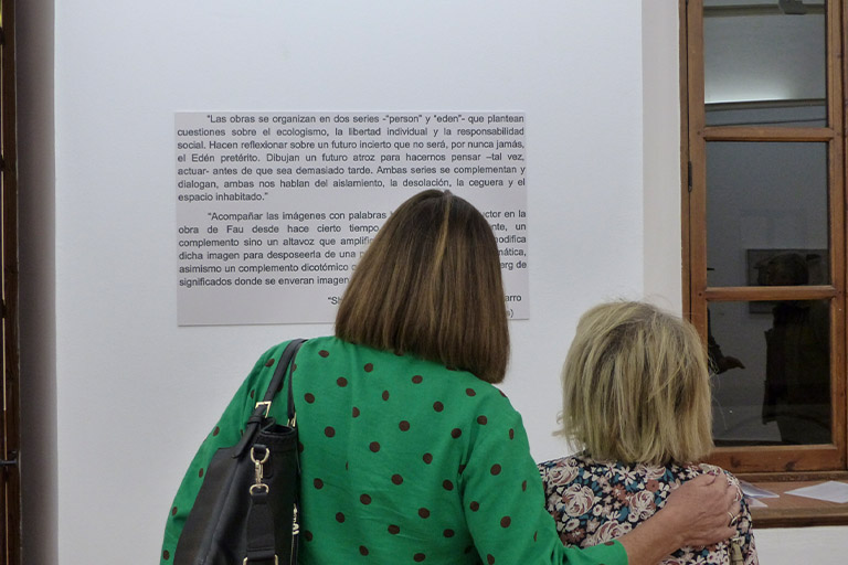 Acompañar las imágenes con palabras ha sido un hilo conductor en la obra de Fau desde hace cierto tiempo. No son, necesariamente, un complemento sino un altavoz que amplifica el mensaje y –tal vez- modifica dicha imagen para desposeerla de una primera intención poética y dramática, asimismo un complemento dicotómico que enriquece el discurso, un iceberg de significados donde se enveran imagen y palabra; todo ello salpimentado con altas dosis de ironía –tal vez, sarcasmo-. Así, el uso de la yuxtaposición de imagen y palabra, es una forma de quitar a la imagen su pureza muda, pero, a la vez, dotarla de un sesgo mágico. En los visillos del anochecer flotan, estampadas, las palabras que dicen sin decir, se dispara una bala equivocada y asoma, con disimulo, la enigmática figura.