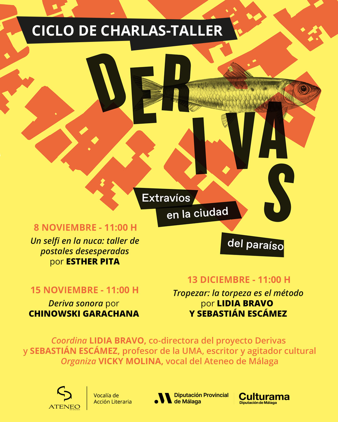 Estos talleres vienen a dar continuidad al proyecto Derivas, extravíos en la ciudad del paraíso (https://ateneomalaga.org/derivas/). Cada una de las charlas-taller se concibe como un minilaboratorio de creación de la ciudad. Una fotógrafa, un artista sonoro, una escritora y un activista ofrecerán inspiración, orientaciones y recursos para que experimenten con ellos los participantes en los talleres durante un corto paseo por la ciudad y puedan dar expresión artística a esa experiencia.