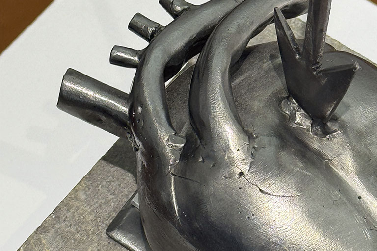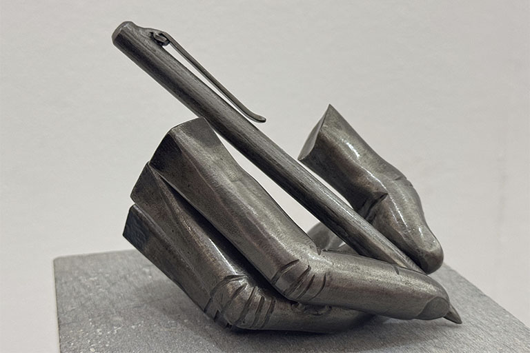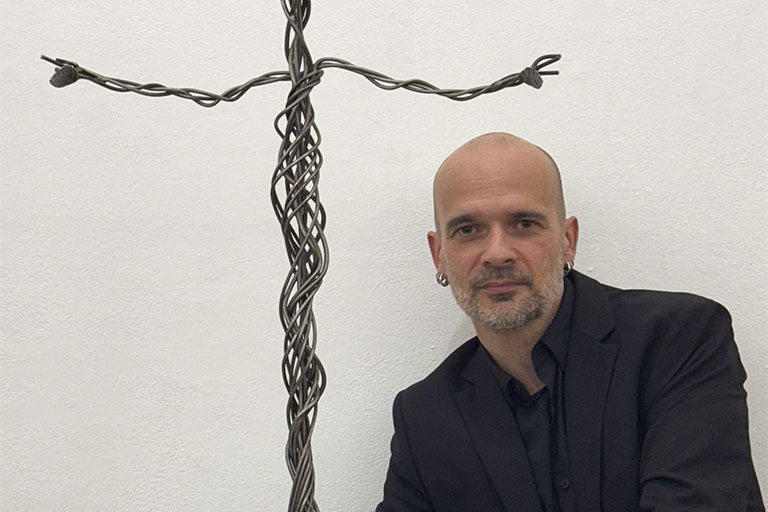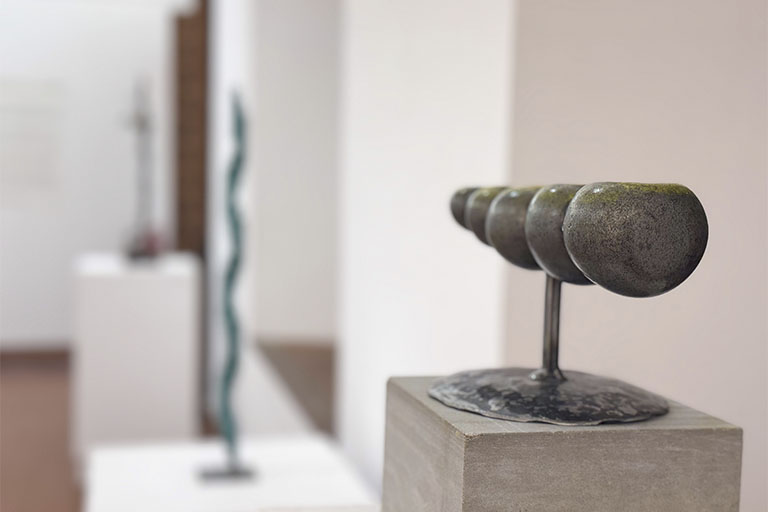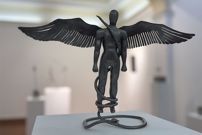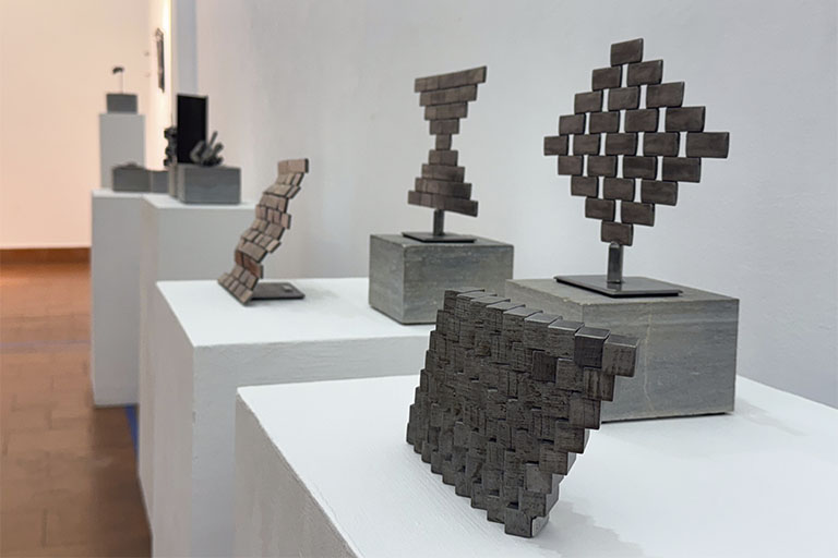 La sensibilidad de Juanjo Almeda, también poeta, salta de sus versos a la cementita para contarnos a través de su obra una historia que arranca desde el origen de la creación para pasar por distintos estadios físicos y emocionales que necesitan transcender, representándolos a través de esculturas que nacen del mismísimo corazón del acero. Ha trabajado incluso con el wolframio, el metal más fuerte de la tierra, contrastando tal dureza con lo sutil de la temática que pone a su servicio, al servicio de una vulnerabilidad tan propia como humana que no finge, para mostrarse al mundo sin miedo.