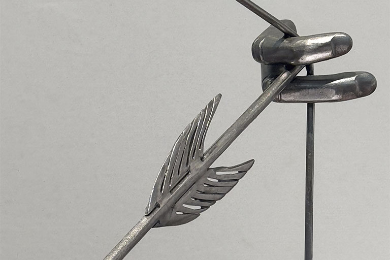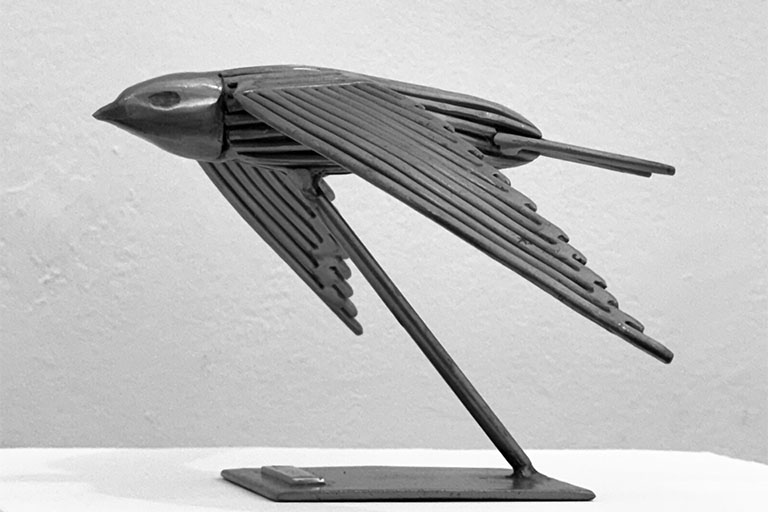 Juanjo Almeda ha elegido el acero –que es el granito del hierro- para su obra escultórica realizada a mano, utilizando sólo la soldadura eléctrica y las amoladoras, con las que configura sus piezas, de un innegable aliento poético.